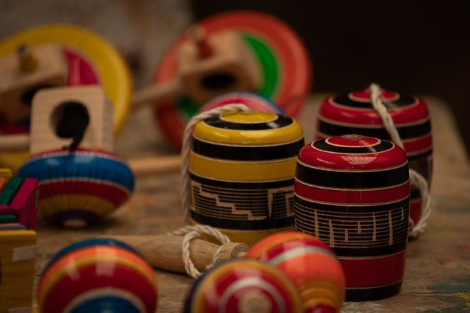 “Obviamente hay que comprar la madera, después la seleccionamos y ya vemos qué pedazo de madera nos sirve. Ya sea para hacer un trompo empezamos a cortarla, después medio se redondea antes de meterla al torno y ya después el proceso siguiente es pasarla en el torno donde ya sale la forma del trompo y pasa al torno a pintura donde ya se le decora de colores o hacerle una greca”, detalla, López.