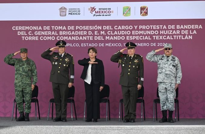 #EstadoDeMéxico.- La Maestra Delfina Gómez Álvarez, Gobernadora del Estado de México asistió a la Toma de Posesión del Cargo y Protesta de Bandera del General Brigadier Diplomado de Estado Mayor, Claudio Edmundo Huizar de la Torre, como Comandante del Mando Especial Texcaltitlán, acción que forma parte de la Estrategia de Seguridad del Estado Mexicano como el objetivo de regresar la paz en la región sur de la entidad mexiquense.