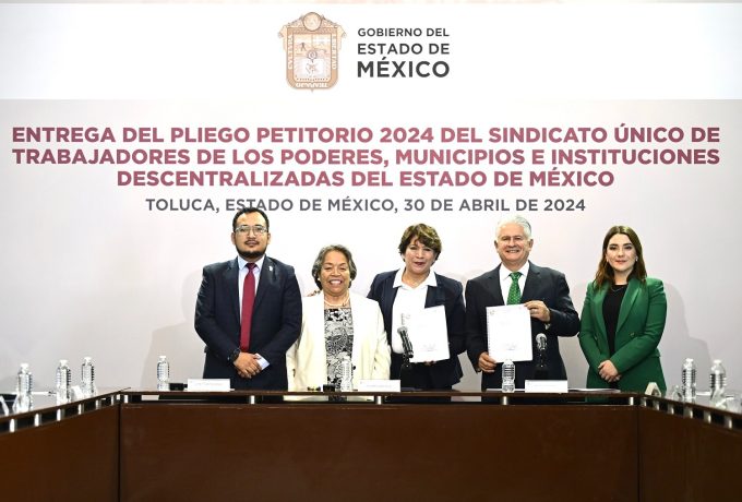 #EstadoDeMéxico.- La Gobernadora del Estado de México, Delfina Gómez Álvarez recibió a la dirigencia e integrantes del Sindicato Único de Trabajadores de los Poderes, Municipios e Instituciones Descentralizadas del Estado de México (SUTEYM), quienes entregaron el Pliego Petitorio del Convenio de Prestaciones 2024.