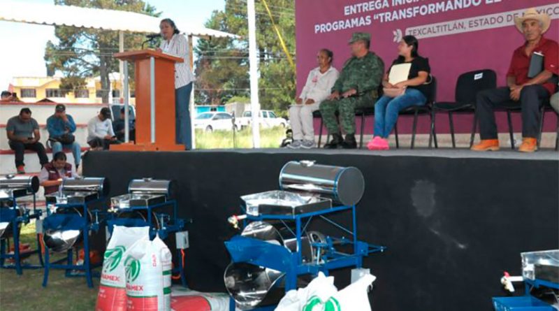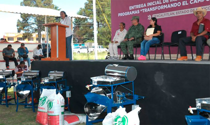 En Texcaltitlán se entregaron: mejoradores de suelo, semillas, plántulas, abonos orgánicos, abonos agroecológicos, fertilizantes, equipos, herramientas, maquinaria, módulos de invernadero, sistemas de riego, pies de cría de diferentes especies pecuarias, maquinaria y mobiliario.