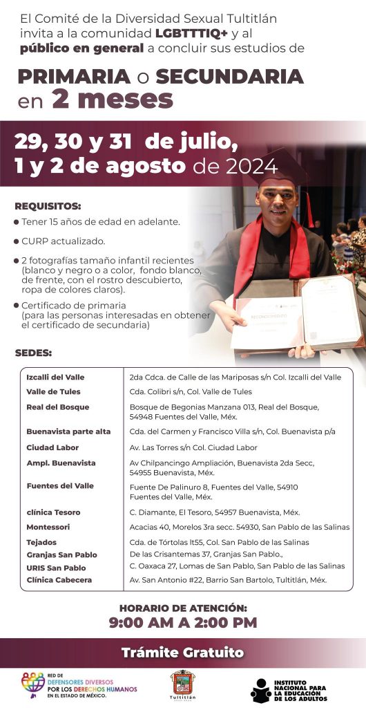 #Tultitlán, #Edoméx.- Para todos los vecinos de Tultitlán, el ayuntamiento recordó que este próximo 29, 30, 31 de julio, 1 y 2 de agosto de 2024, estarán realizando el registro para las personas que necesiten concluir sus estudios a nivel PRIMARIA o SECUNDARIA.
