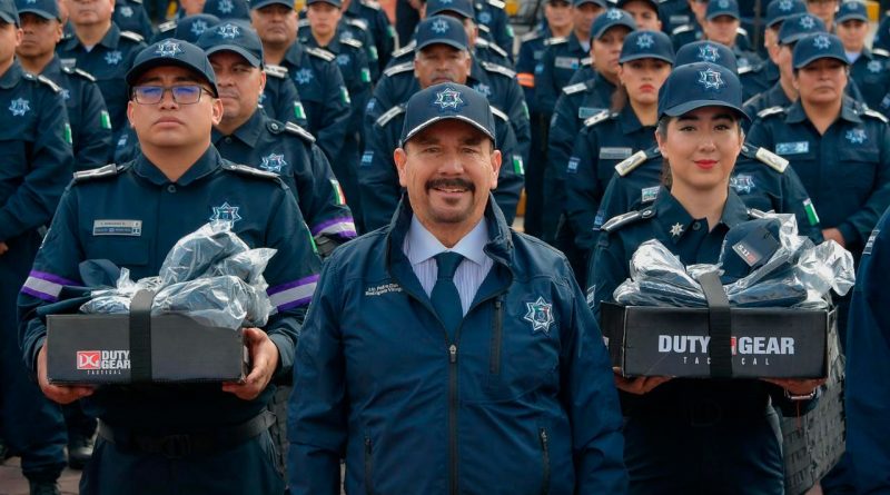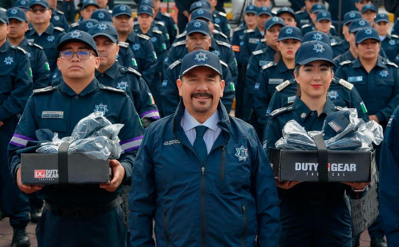Recientemente, les entregó 250 chalecos balísticos y una nueva dotación de uniformes de la marca 5.11 equivalente a 2 mil 616 (dos por cada elemento), conformados por camisola y pantalón, además de botas, cinturones, gorras y chamarras.