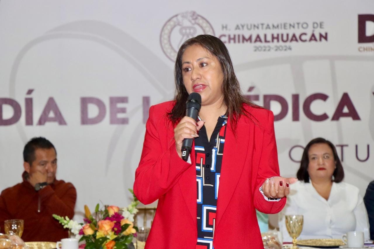#Chimalhuacán, #Edoméx.- En el acto conmemorativo del Día de la Médica y el Médico, la Presidenta de Chimalhuacán, Xóchitl Flores Jiménez, reconoció la importante labor de los médicos en el municipio y su invaluable participación en el cuidado de la salud de la población: «Es fundamental que nosotros reconozcamos la labor que ustedes realizan en este gobierno municipal», y destacó que los médicos son los primeros en responder ante emergencias y situaciones delicadas.