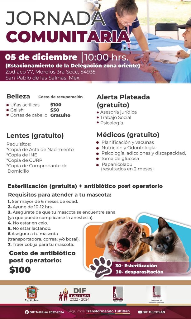 #Tultitlán, #Edoméx.- El próximo 5 de diciembre, los vecinos y vecinas de Tultitlán están invitados a participar en la #JornadaComunitaria, que se llevará a cabo de 10:00 a 14:00 horas en el estacionamiento de la zona oriente, ubicado en Zodiaco 77, Morelos 3ra Sección, San Pablo de las Salinas, en el municipio de Tultitlán, Estado de México. Este evento tiene como objetivo ofrecer una variedad de servicios gratuitos a la comunidad.