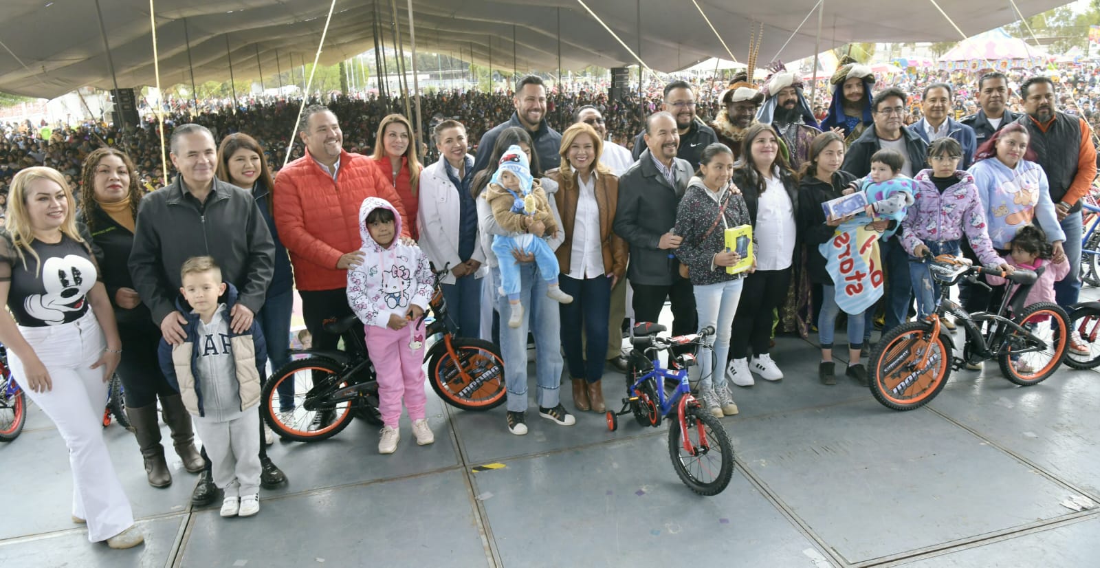 #Atizapán, #Edoméx.- La Presidenta de DIF Atizapán, la Profesora Patricia Arévalo Rubio y el Presidente Municipal Pedro Rodríguez Villegas festejan con miles de atizapenses el Día de Reyes en el Deportivo Zaragoza. Ante la Presencia del Diputado Anuar y el nuevo cuerpo edilicio de la Administración entregaron regalos a niñas y niños que disfrutaron las rifas y el espectáculo de Lagrimita y Costel.