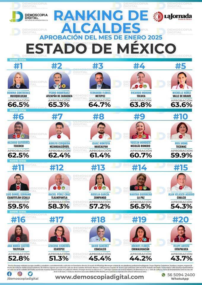 Los presidentes municipales que cumplieron su primer mes al frente de sus respectivos ayuntamientos y que fueron rankeados en los 10 primeros lugares son Ricardo Moreno, en Toluca; Nazario Gutiérrez, en Texcoco; Isaac Montoya, en Naucalpan; Yoselyn Mendoza, en Villa Nicolás Romero, y Rosi Wong, en Tecámac.