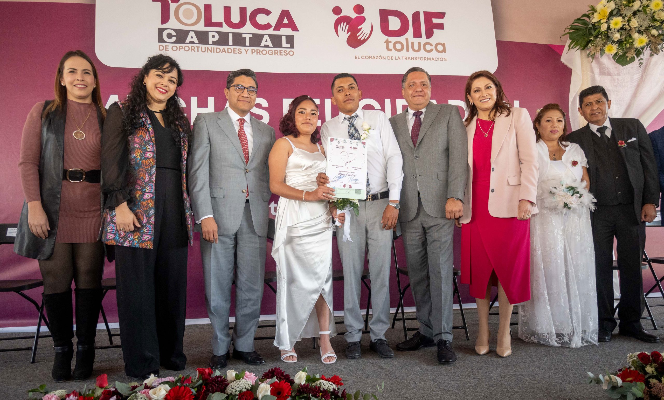 Durante la ceremonia, la Presidenta Honoraria del DIF Toluca, Rocío Pegueros Velázquez, destacó que este símbolo de alianza representa esperanza, fortaleza y crecimiento para nuestro municipio. Además, a las parejas les deseó un matrimonio lleno de amor, respeto y comprensión, con el que, a través del compromiso y amor, superarán cualquier obstáculo que se les presente.