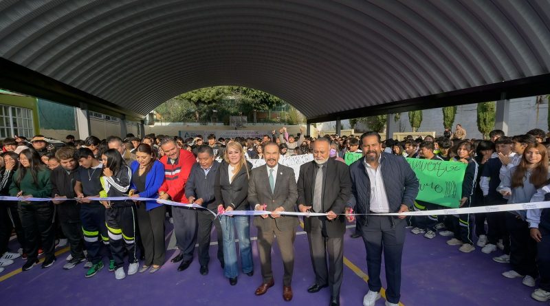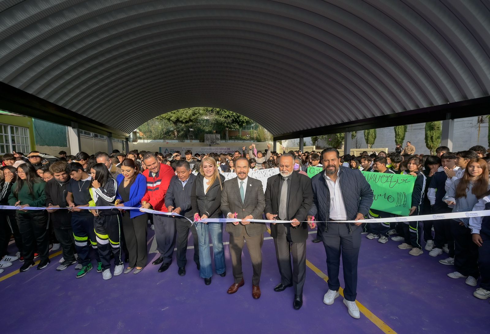 La entrega del nuevo arcotecho en la Preparatoria Oficial No. 64. Este espacio beneficiará a cientos de estudiantes, quienes ahora podrán realizar sus actividades al aire libre sin importar las condiciones climáticas.