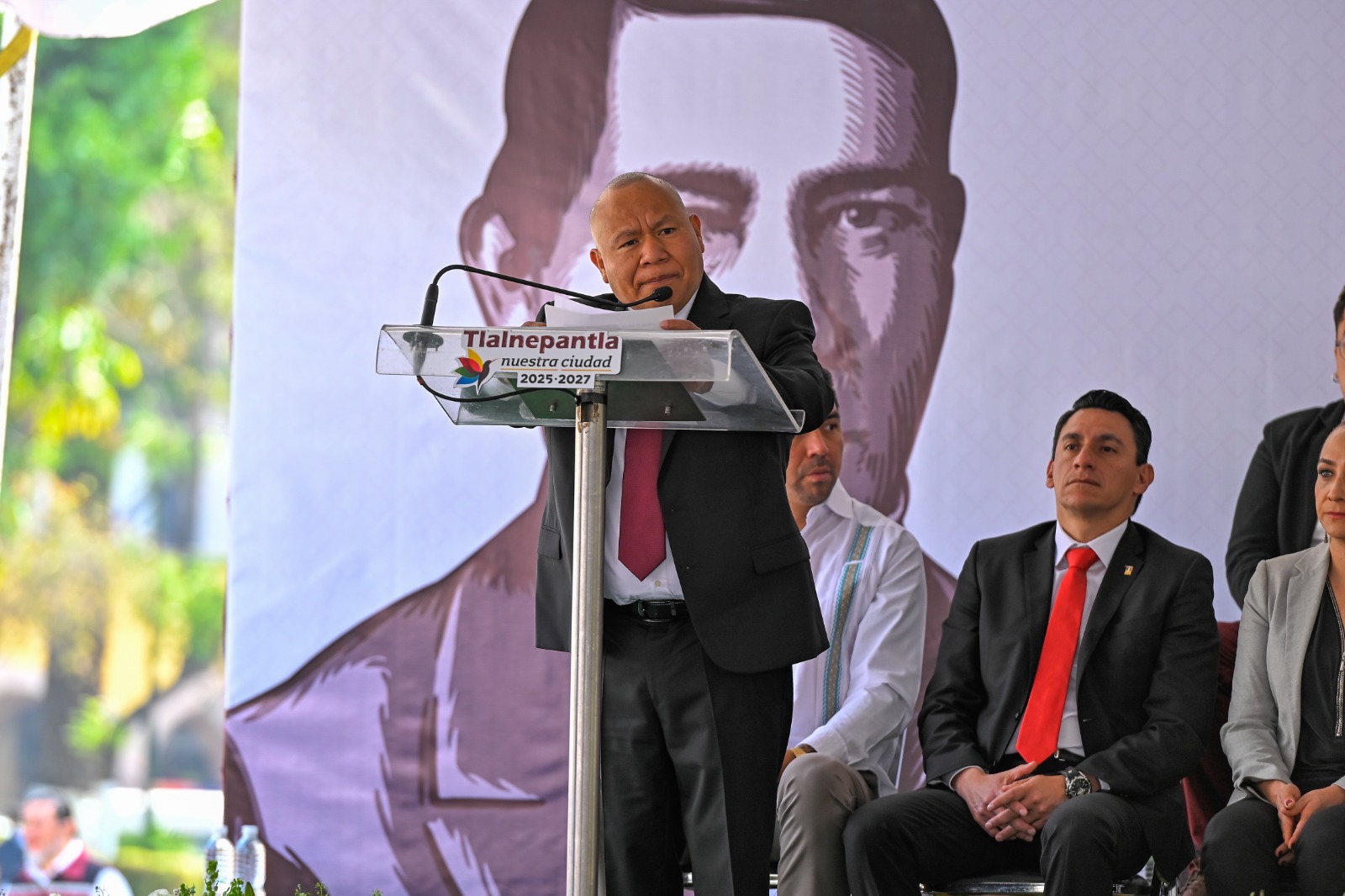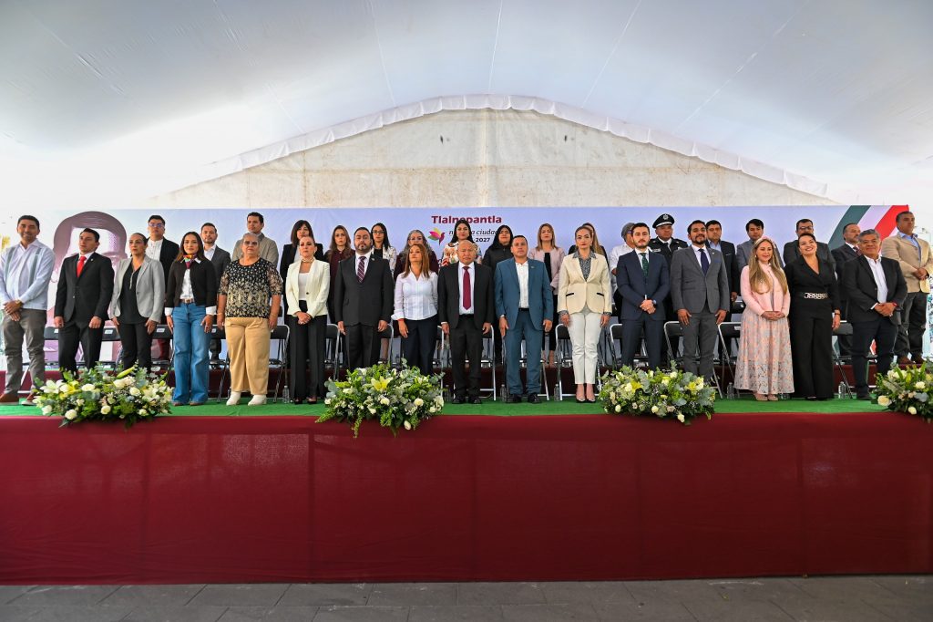 #TlalnepantlaDeBaz, #EstadoDeMéxico. – El presidente municipal Raciel Pérez Cruz encabezó la Ceremonia de Conmemoración por el 219 Aniversario del Natalicio de Benito Juárez en la explanada del Palacio Municipal, en donde exclamó “México antes de Juárez y después de Juárez, simplemente la Patria”.