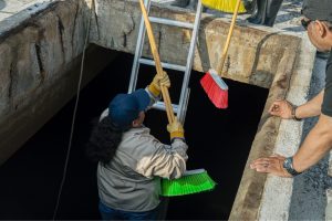 Los trabajos consistieron en una primera etapa de barrido y cepillado manual, en la que se extrajo tierra y lodo del interior del tanque utilizando escobas, palas y cubetas para su retiro. Posteriormente, con el apoyo de pipas de agua potable y camiones de presión-succión, se procedió a lavar y desinfectar las paredes internas.