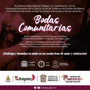 #Tultepec, #EstadoDeMéxico.- El Gobierno Municipal de Tultepec, presidido por Sergio Luna Cortés, invita a todas las parejas interesadas a participar en las bodas comunitarias. Esta actividad se realiza en coordinación con las Caravanas Itinerantes de la Justicia Social. El evento tiene como objetivo fomentar la unión legal y el bienestar familiar. La invitación está abierta a todas las parejas que deseen formalizar su relación.
