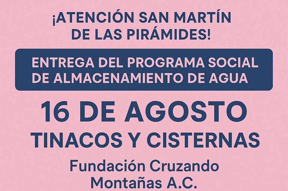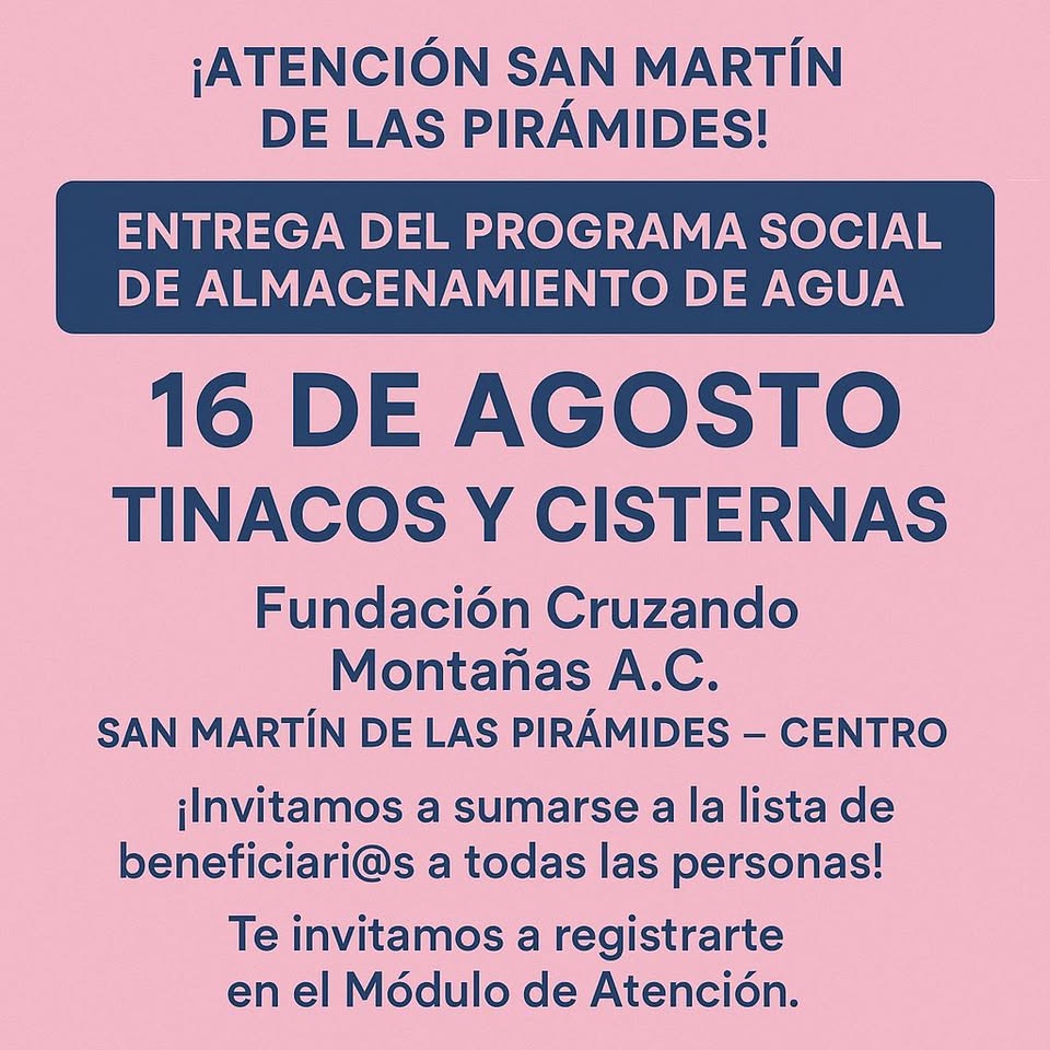 #SanMartínDeLasPirámides.- Nos llena de alegría anunciar que este próximo Sábado 16 de AGOSTO 2025, se llevará a cabo la ENTREGA DE TINACOS Y CISTERNAS en San Martín de las Pirámides – CENTRO, como parte de nuestro Programa Social de Almacenamiento de Agua.