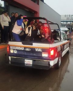 El comisario Roberto Escobar Calderón informó que los elementos recorren las colonias afectadas para brindar auxilio, mantener el orden y apoyar en la movilidad vial. Su presencia permite actuar de forma rápida ante calles anegadas, vehículos varados o zonas con riesgo de encharcamiento severo.